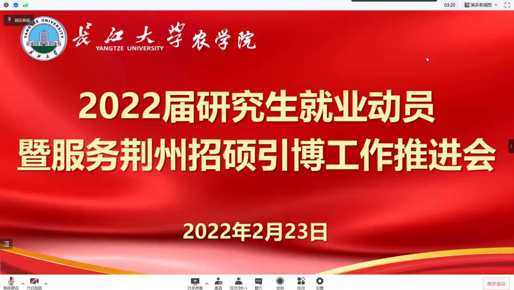 (通讯员 林香亮 陈龙艳)2月23日下午,bet36365路检测中心召开2022届研究生就业动员暨服务荆州招硕引博工作推进会。副院长方正武、农学系书记王书平、植保系主任董小林、农资系书记陈小慧、就业专干刘庆、研究生辅导员林香亮、兼职辅导员张苗苗和全体2022届毕业研究生参会,党委副书记谭亮魁主持会议。
