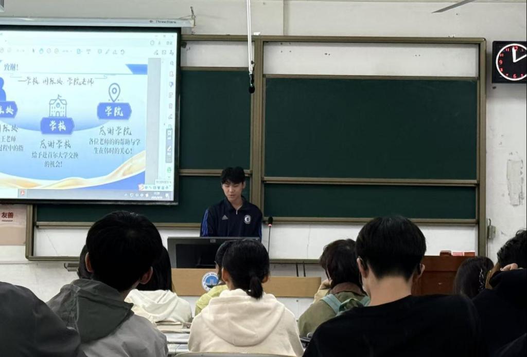 同时,他也总结了在交换学习中的苦与乐,分享了在陌生环境遭遇挫折时调整心态、继续前行的心路历程,以及面对跨文化差异压力时自我调节和有效沟通的方法。陈彦戎同学结合个人经历,在项目信息获取、语言能力(韩语或英语)准备、行前规划等方面给出实用建议,并向学校、国际处及学院老师的指导与帮助表达了感谢。