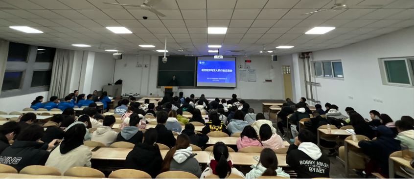 会议开始,胡良谋首先向大家介绍了本次交流会的目的就是要了解低空经济与无人机行业的发展,接着邀请胡金海为大家进行低空经济发展的讲解。胡金海先向同学们介绍了低空经济的相关知识,使同学们对低空经济有了较为清晰的认知。就低空经济的载体,胡金海展开了深度讲解,从狭义和广义两个方面向同学们阐述了飞行汽车,并陈述了飞行汽车的的战略发展方向。接着,胡金海以低空经济发展的历史数据,阐明了当前全球低空经济发展的概况与格局。最后,胡金海结合中外的低空经济发展现状与政策,向同学们说明了当前低空经济发展的前景。